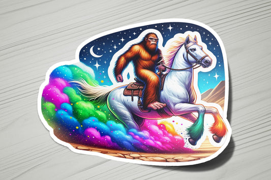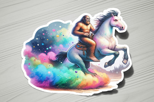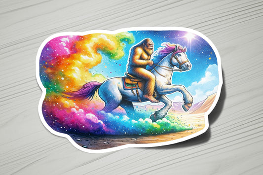 Bigfoot Riding Magical Horse Unicorn 2 Vinyl Sticker | Dishwasher Safe & Durable | Custom Sizes | Fast Shipping | Made in USA